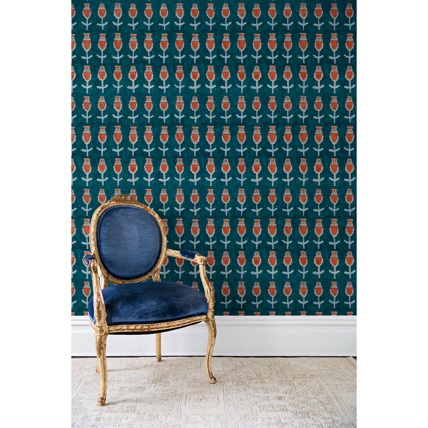 An antique chair in front of a wall papered in repeating rows of a watercolor flowers in red, gray and blue on a turquoise background.