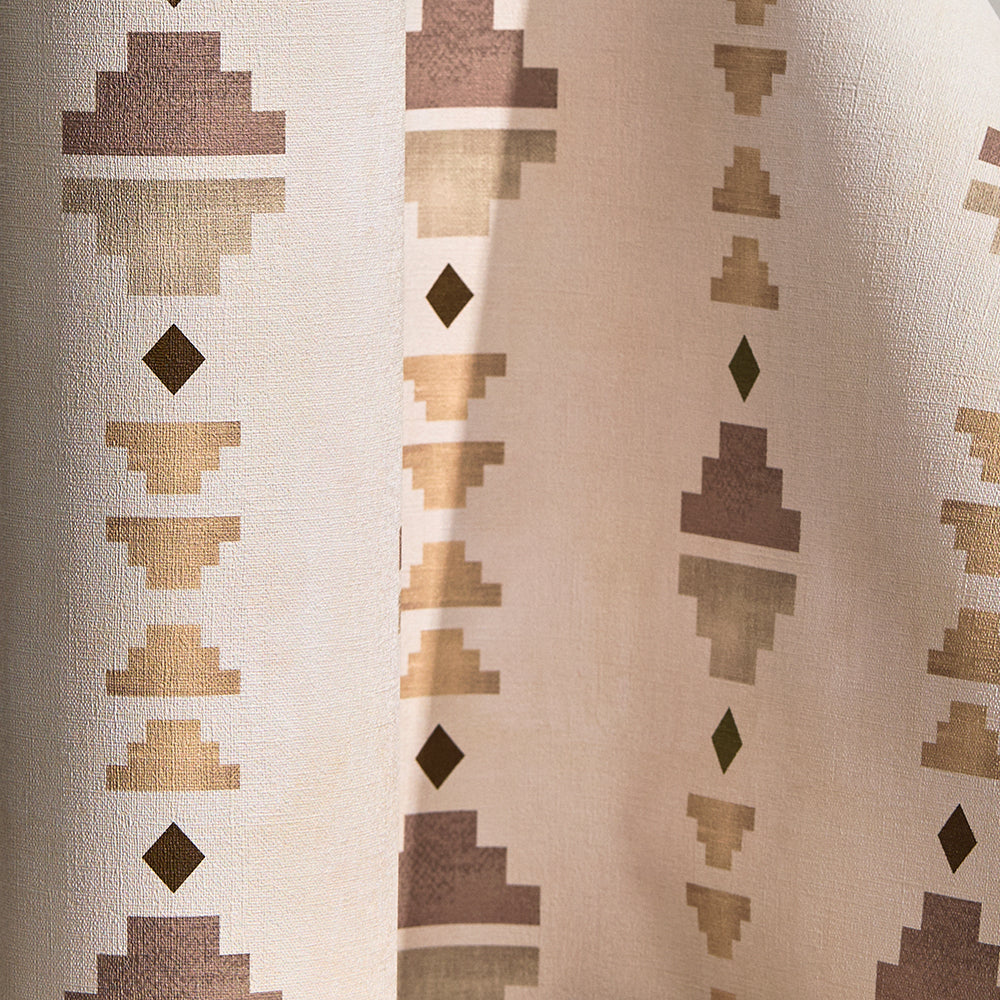 Geometric stair step pattern in blush, taupe, grey, olive and brown on a cream field.