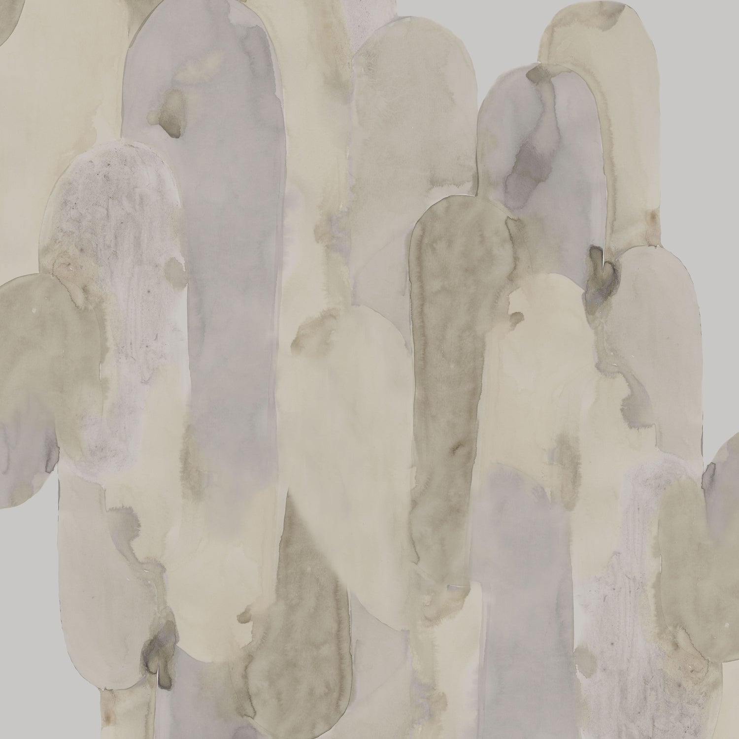 Detail of wallpaper in watercolor elongated pill pattern in tan, taupe and grey on a white field.