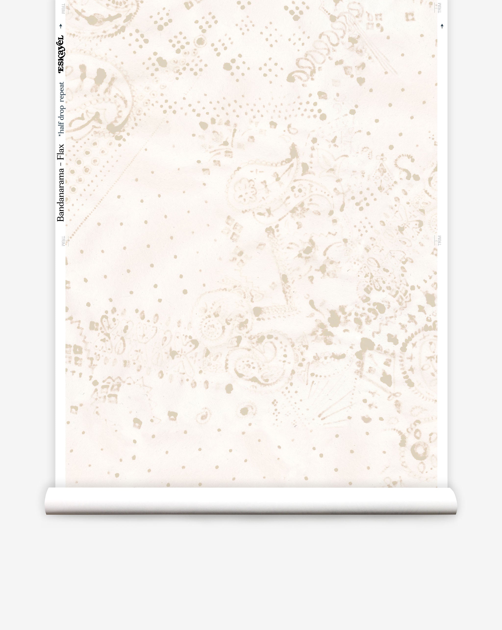 Partially unrolled wallpaper yardage in a painterly bandana print in beige on a cream field.