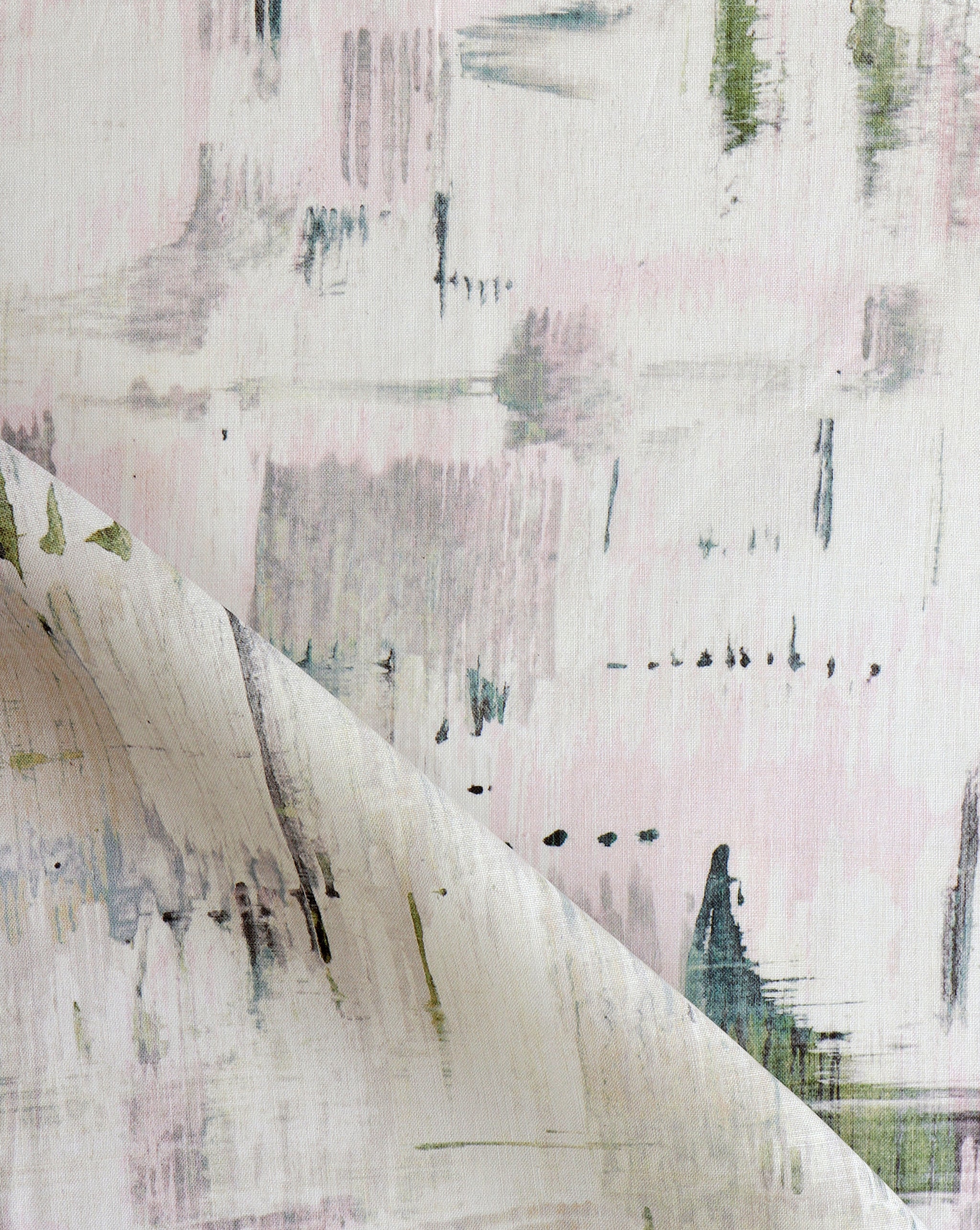 Detail of fabric in a watercolor paint blot print in pink and olive on a white field.
