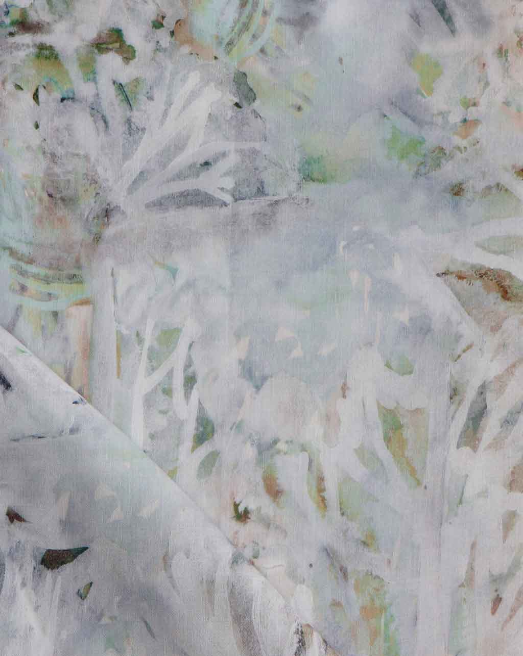 Detail of fabric in a watercolor painterly print in light gray, green and brown on a cream field.