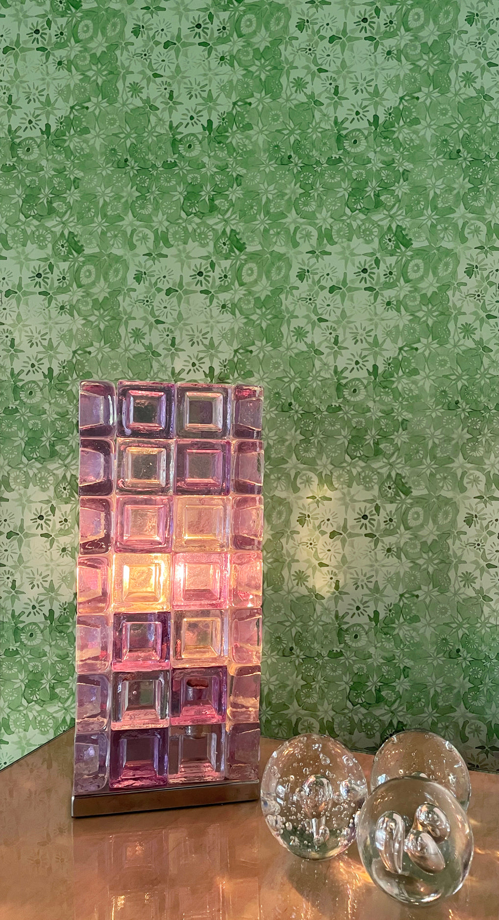 Decorative glass block light on a table with a patterned green wall in the background