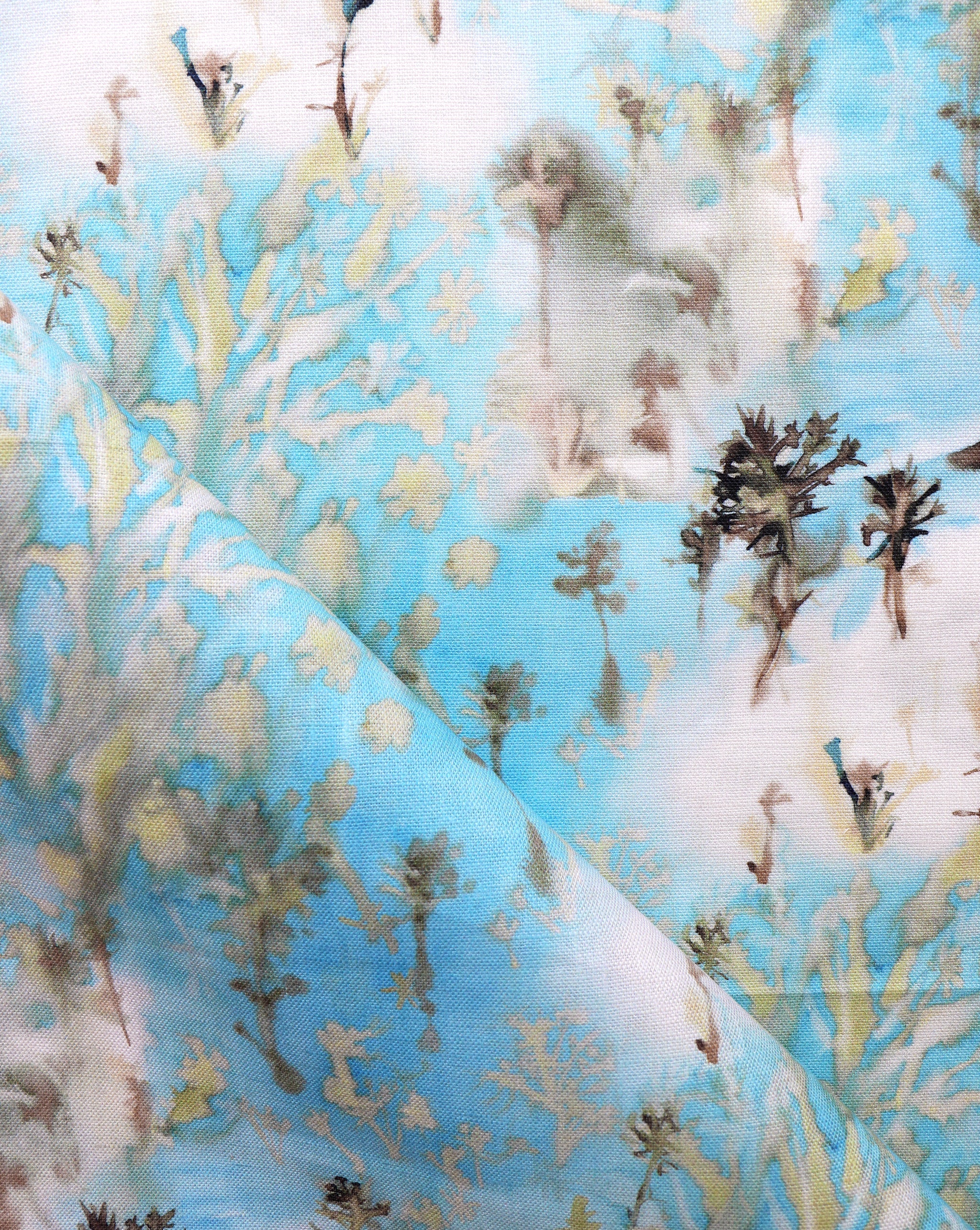 Detail of fabric in a painterly tree print in gray and tan on a turquoise field.