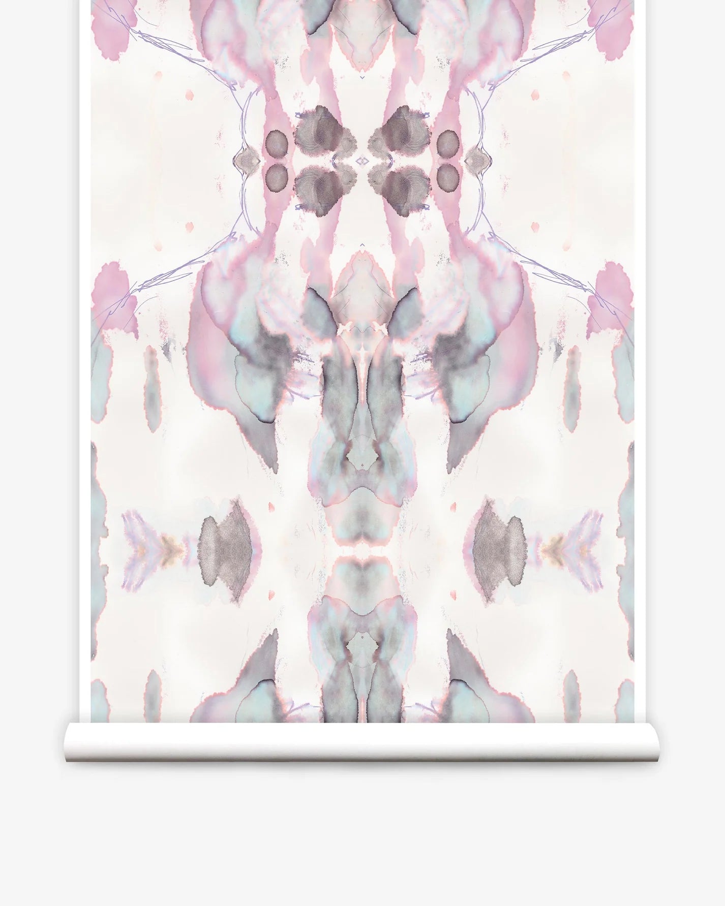 Partially unrolled wallpaper yardage in a watercolor paint blotch print in shades of gray and pink on a white field.