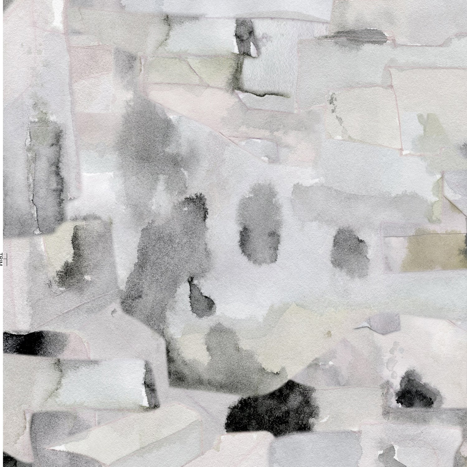 Wallpaper detail in a textural paint blotch print in shades of gray and blue on a light gray field.