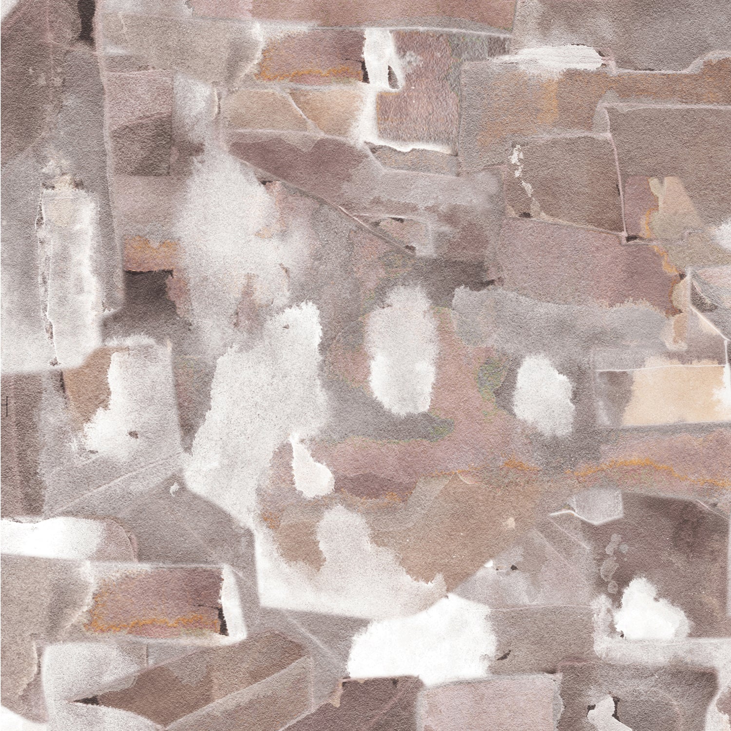 Wallpaper detail in a textural paint blotch print in shades of brown and tan on a white field.