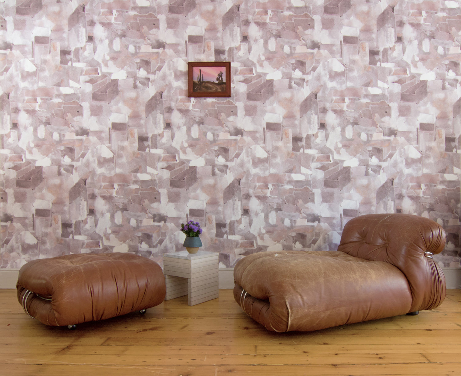 Modern camel leather accent chair against wallpaper in a textural paint blotch print in shades of brown and tan on a white field.