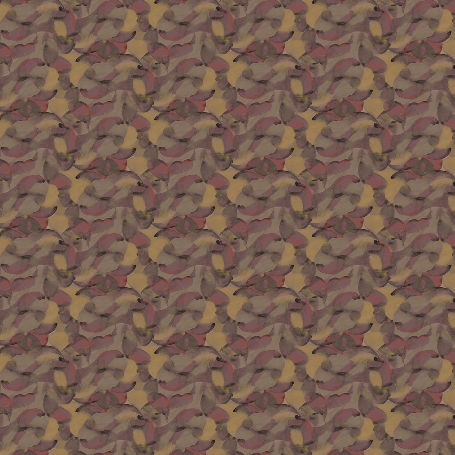 Wallpaper detail in an undulating abstract watercolor motif in purple, taupe, yellow and charcoal.