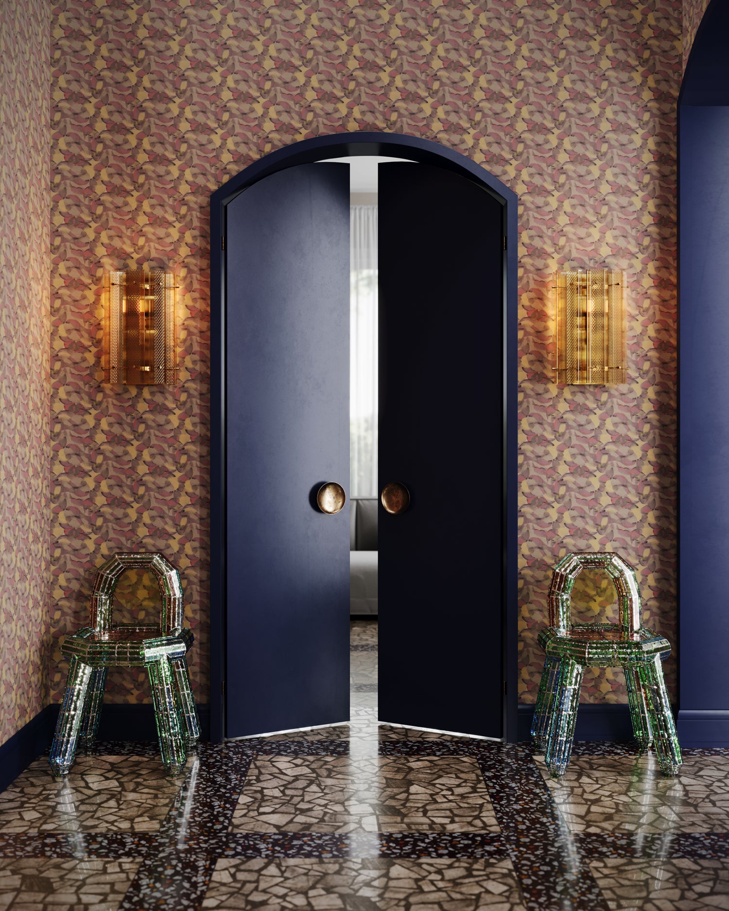 Retro foyer with terrazo floors wallpapered in an undulating abstract watercolor motif in purple, taupe, yellow and charcoal.