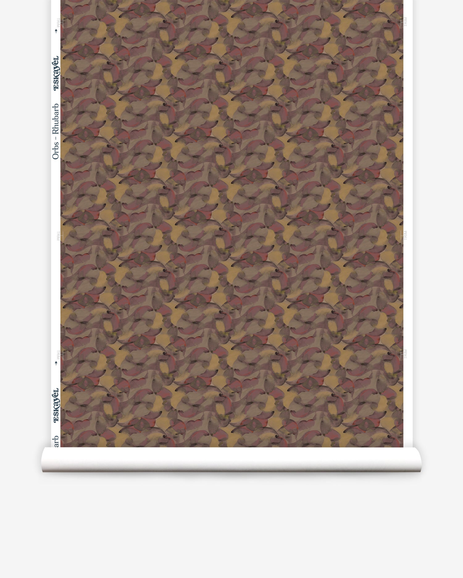 Wallpaper roll in an undulating abstract watercolor motif in purple, taupe, yellow and charcoal.