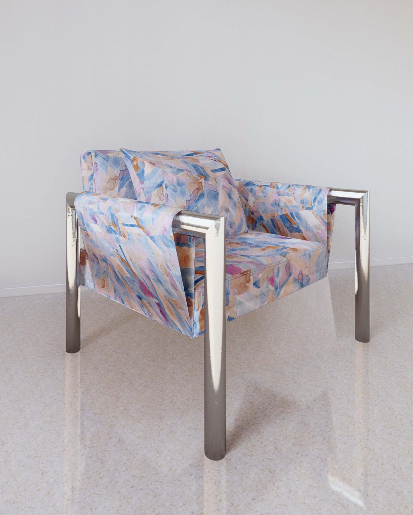 A modernist armchair upholstered in a painterly herringbone fabric in shades of blue, pink and orange.