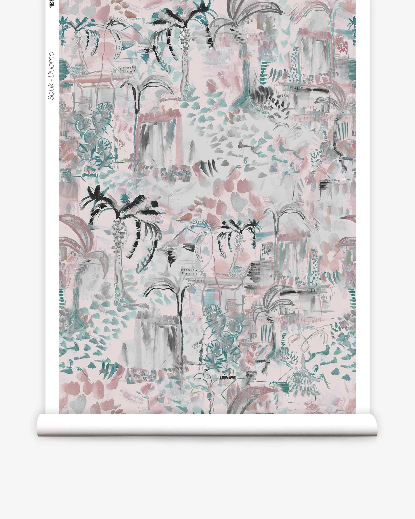 Partially unrolled wallpaper yardage in a painterly tree print in shades of gray, pink and turquoise.