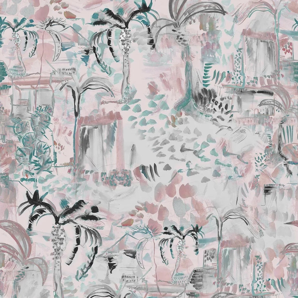 Detail of wallpaper in a painterly tree print in shades of gray, pink and turquoise.