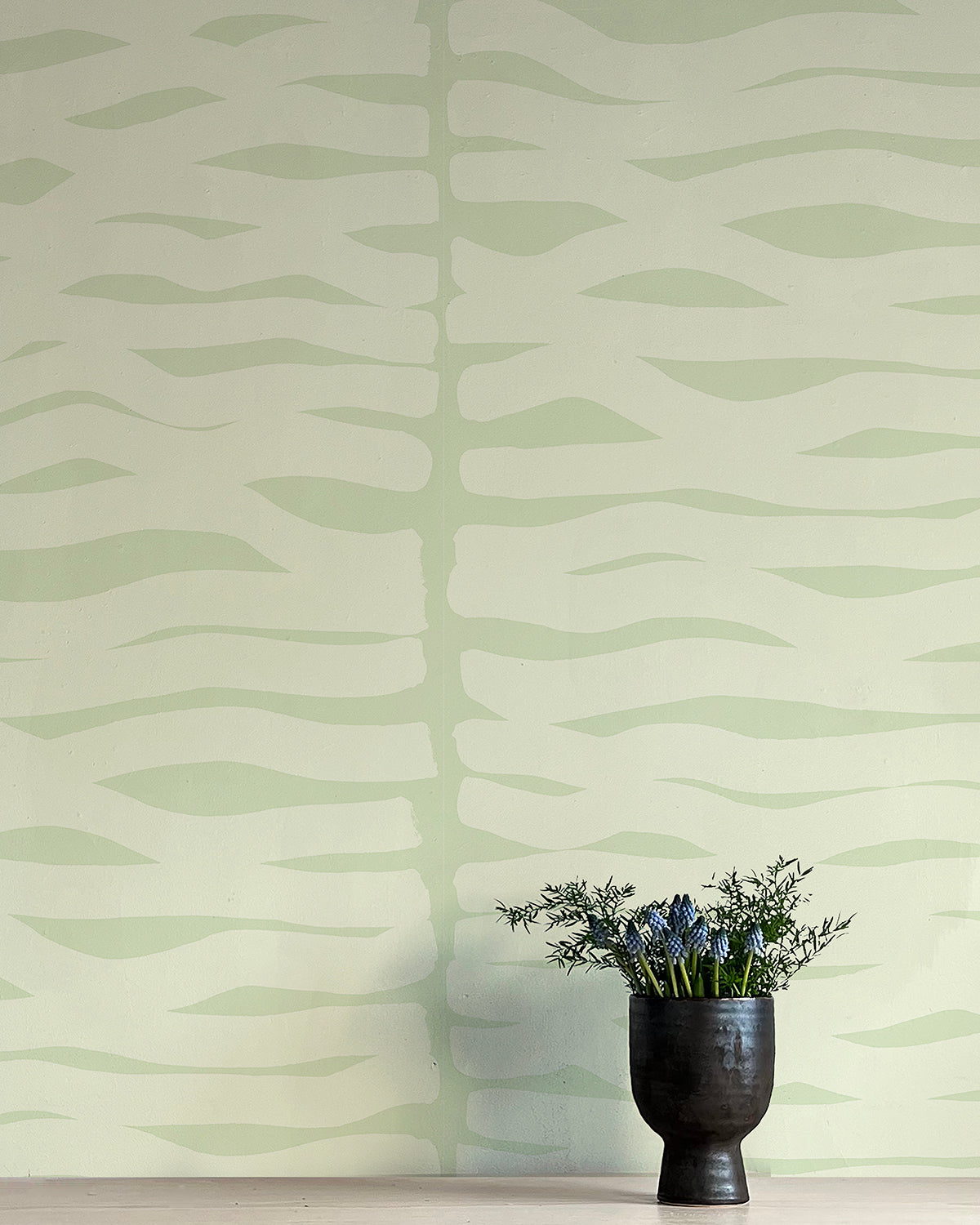 A vase of flowers stands in front of a wall papered in an abstract zigzag pattern in light green on a green field.