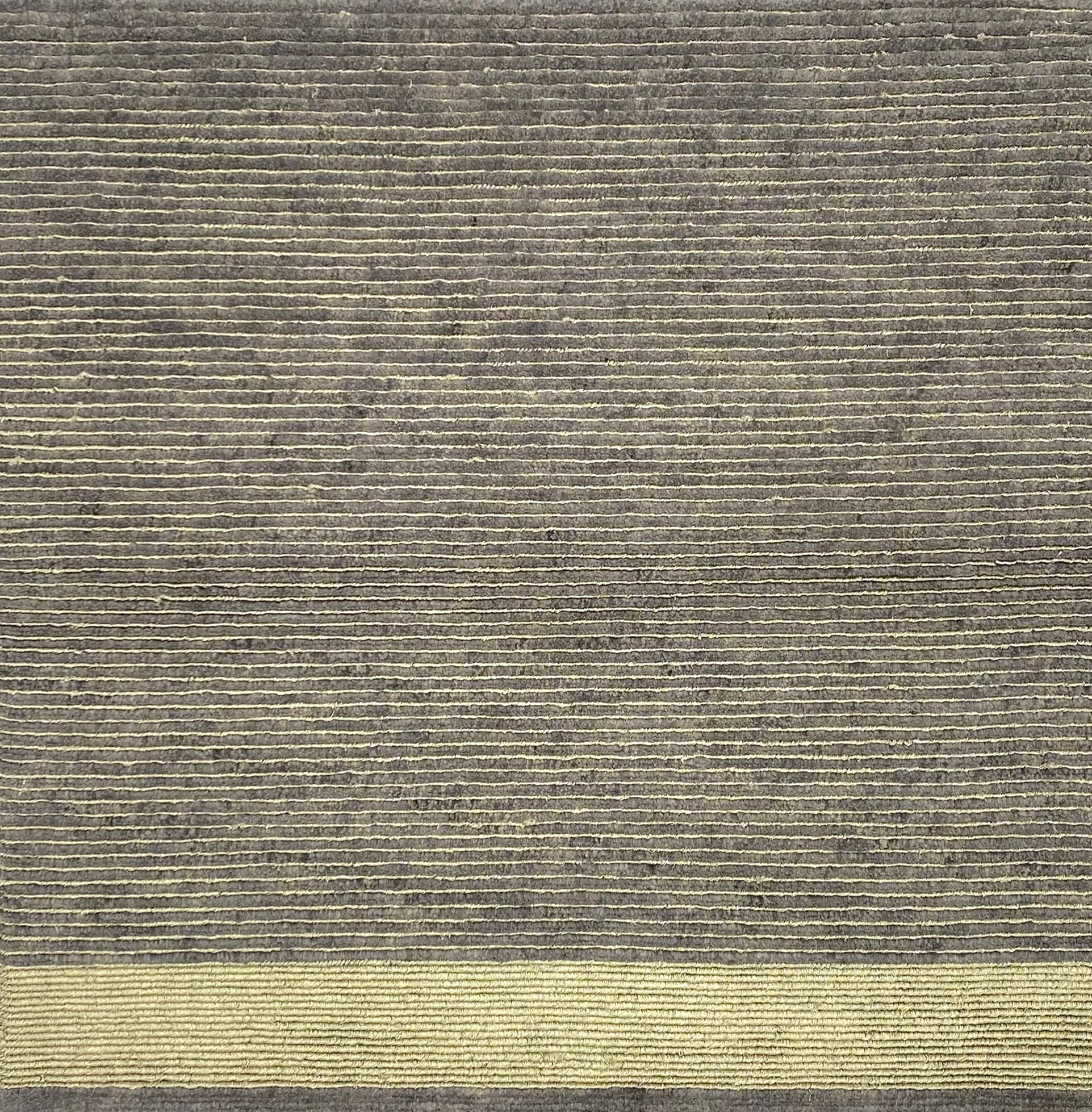 Handknotted rug in a  pewter silk rib with gold metallic stripes and border.