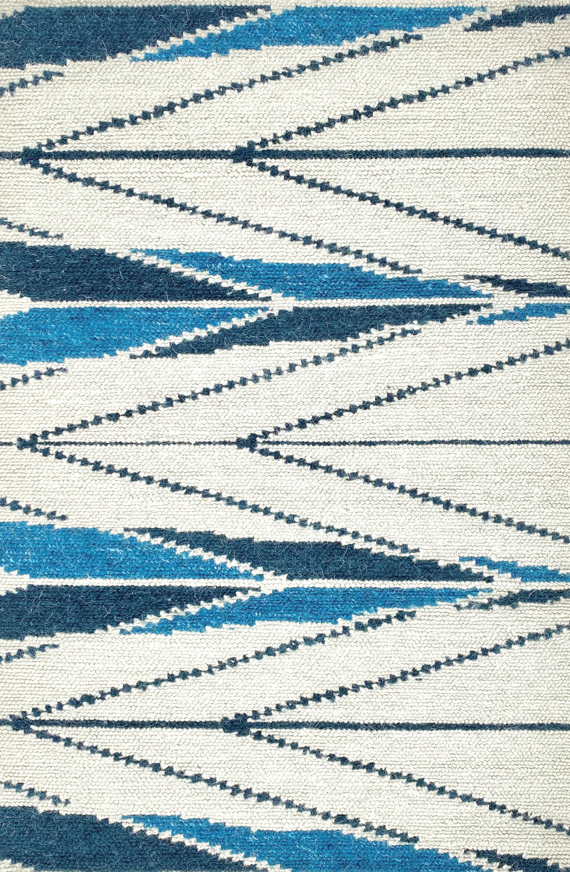 Handknotted rug sample in a modern herringbone design in shades of blue ona. white field.