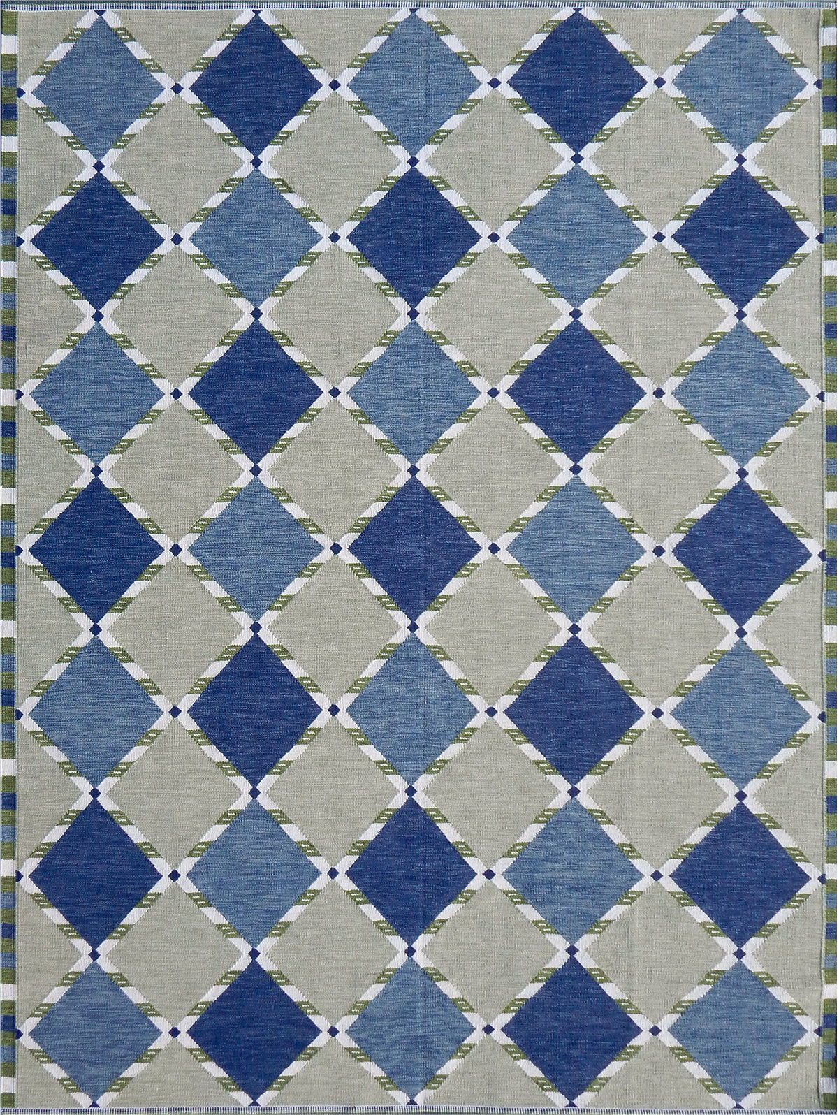 Handwoven rug in a Swedish diamond lattice design shades of green and blue with white accents.
