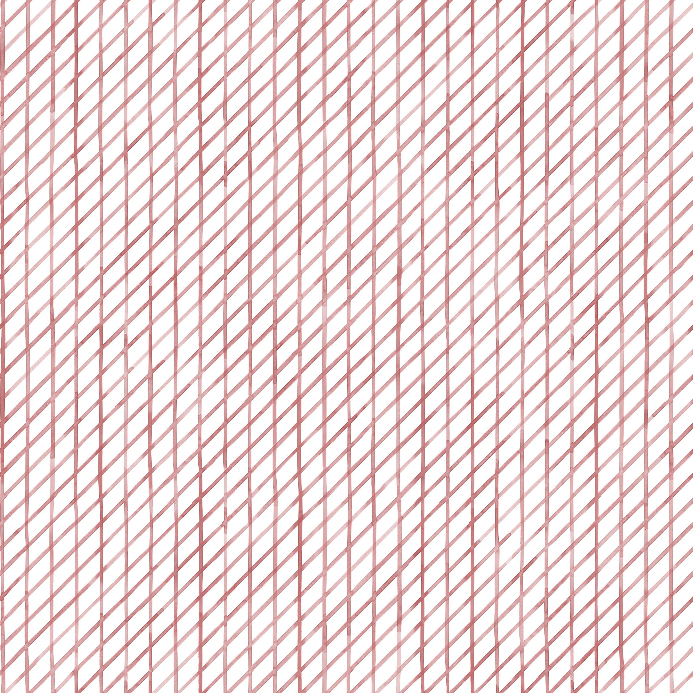 Detail of fabric in a painterly uneven grid pattern in rose on a white field.