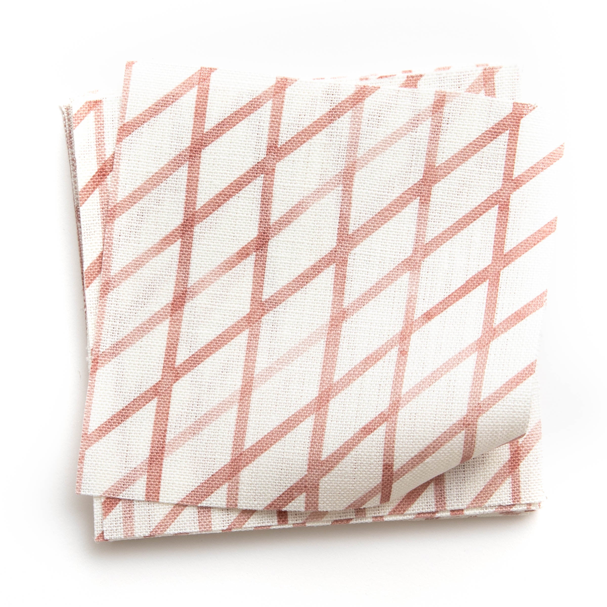 A stack of fabric swatches in an uneven grid pattern in rose on a white field.