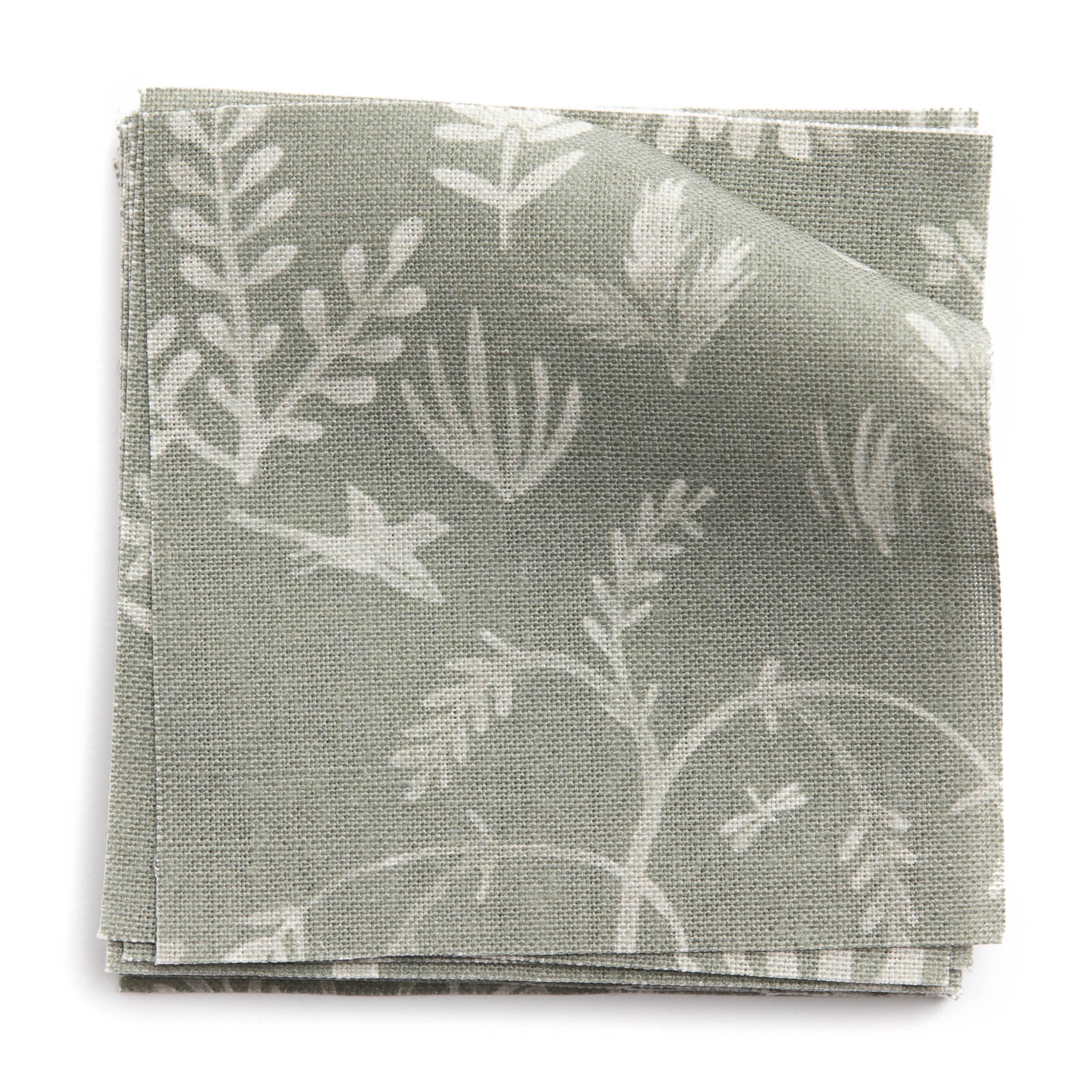 A stack of fabric swatches in a playful animal and tree print in white on a sage field.