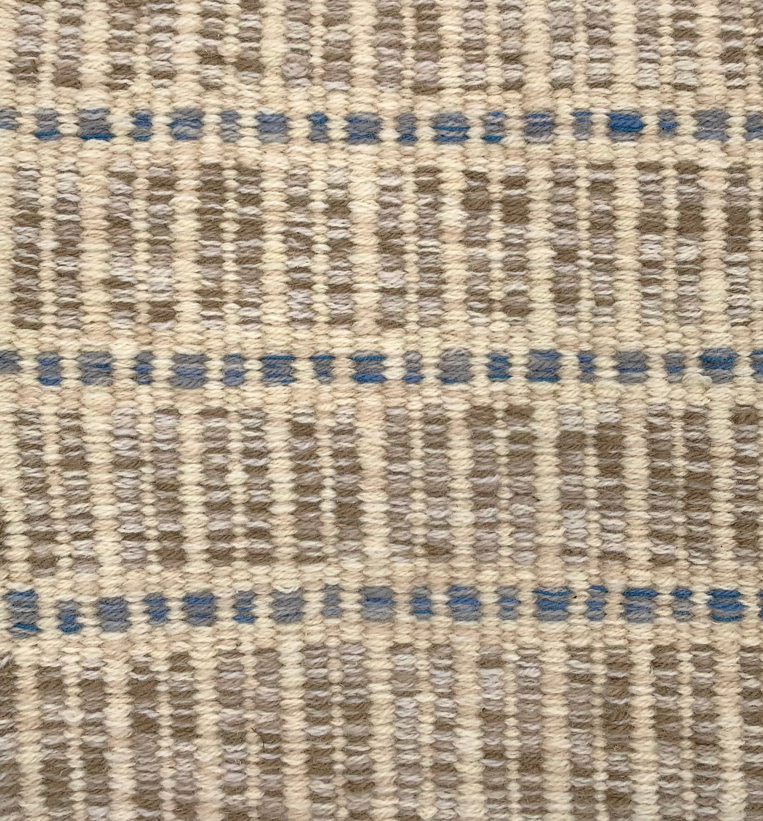 Handwoven rug detail in a textural stripe design in blue, grey and cream