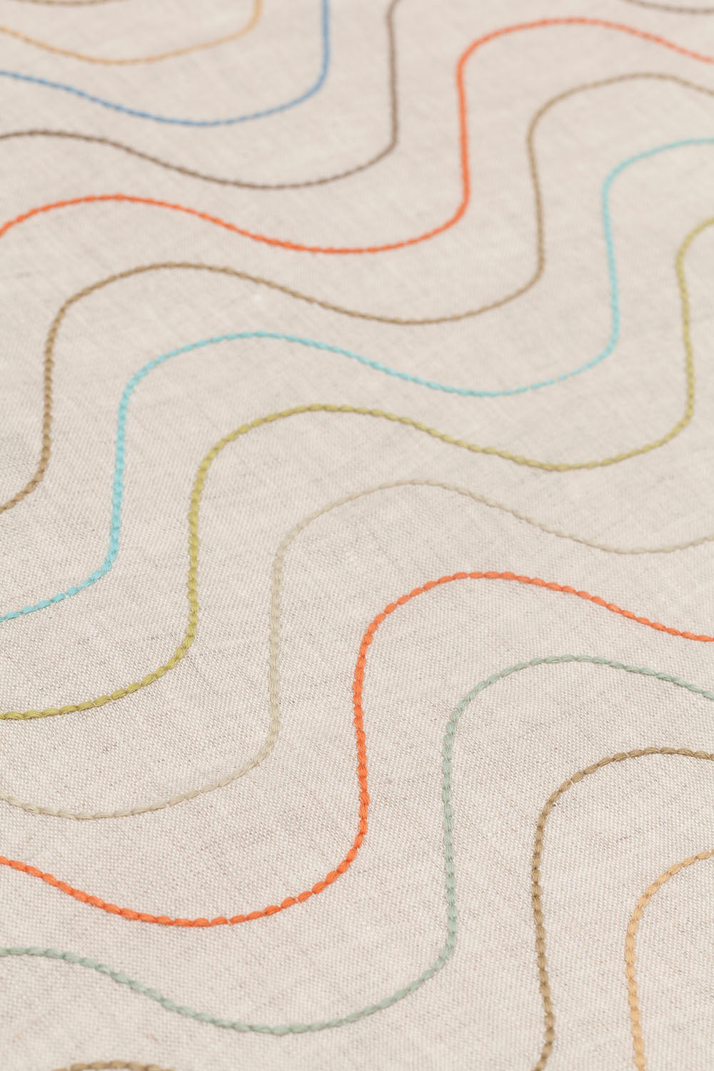 Detail of fabric with an embroidered undulating stripe pattern in shades of yellow, red and blue on a cream field.