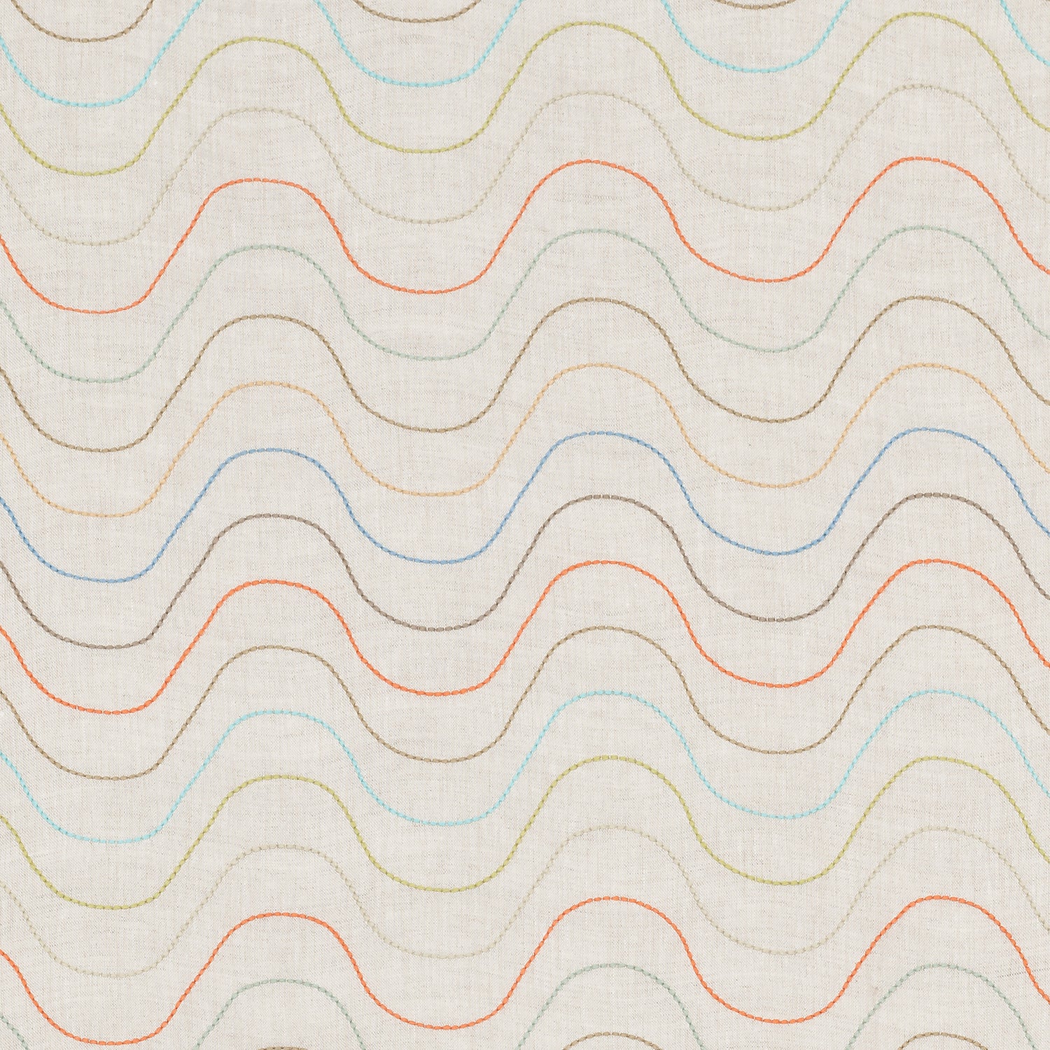 Fabric with an embroidered undulating stripe pattern in shades of yellow, red and blue on a cream field.