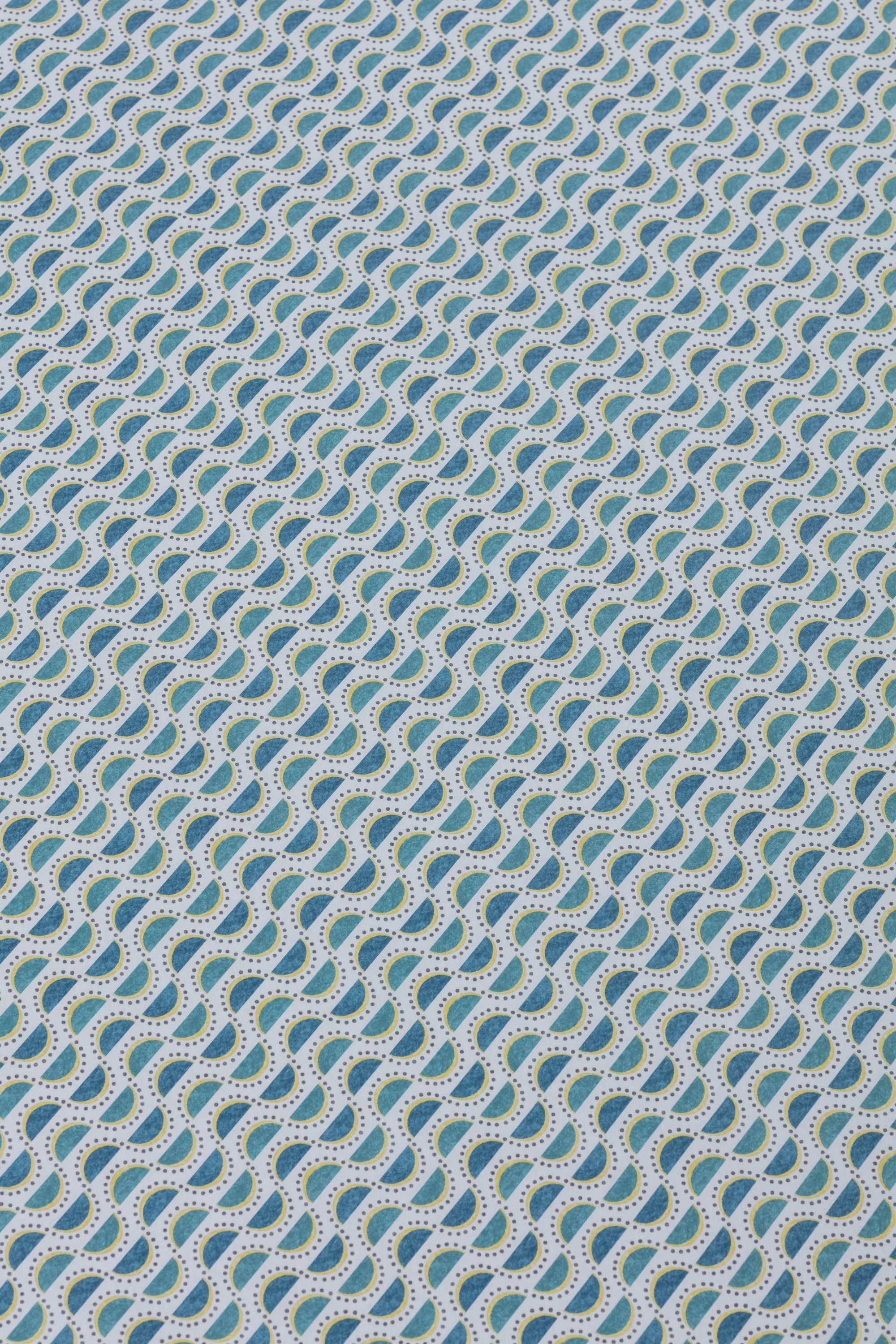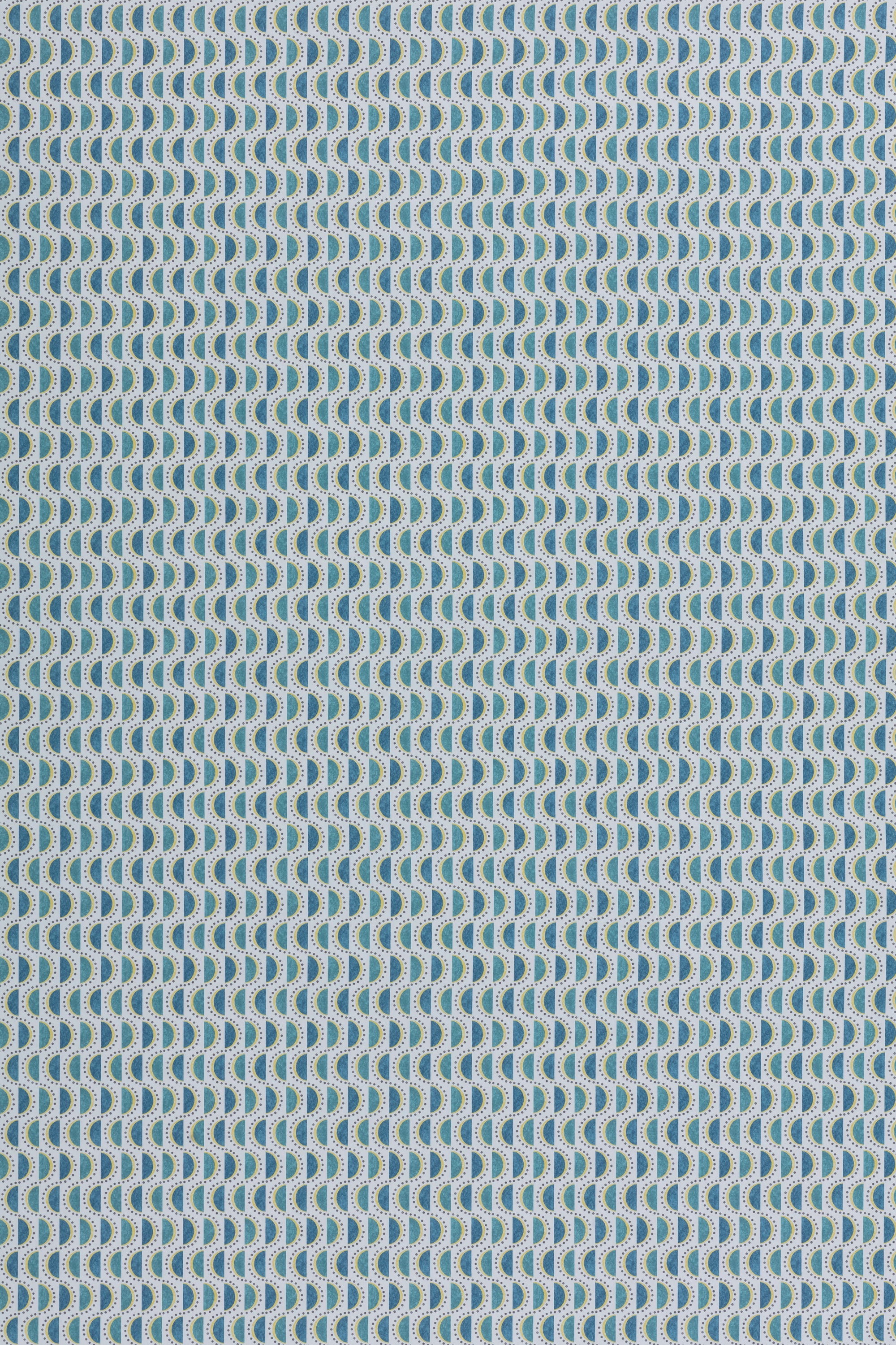 Detail of a wallpaper panel in a linear geometric print in shades of turquoise, blue and yellow on a light blue field.