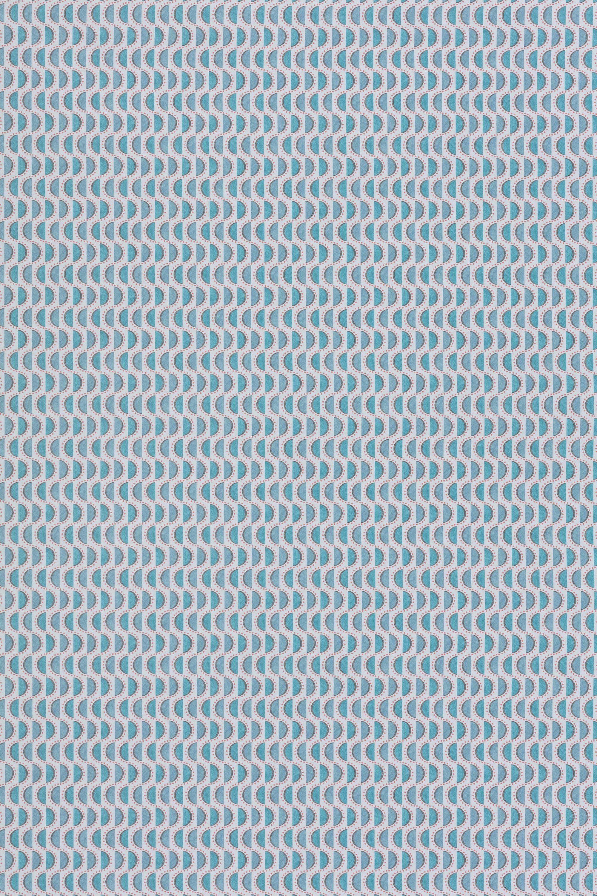 Wallpaper panel in a linear geometric print in shades of blue and pink on a light blue field.