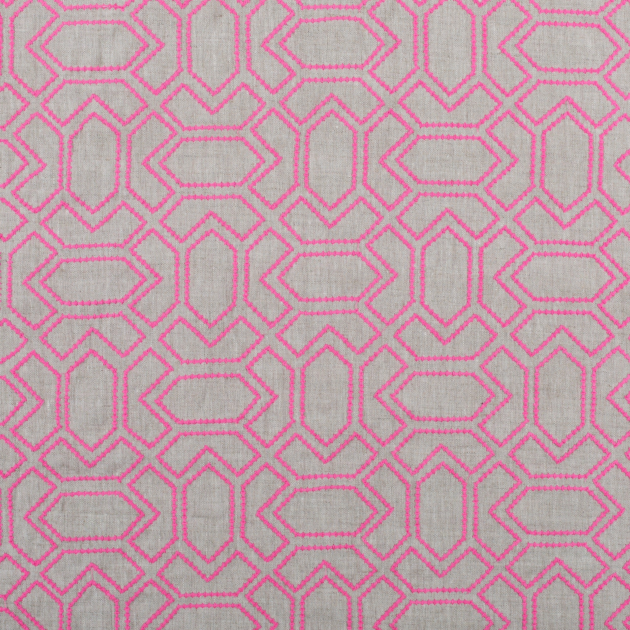 Fabric with an embroidered geometric grid print in pink on a gray field.