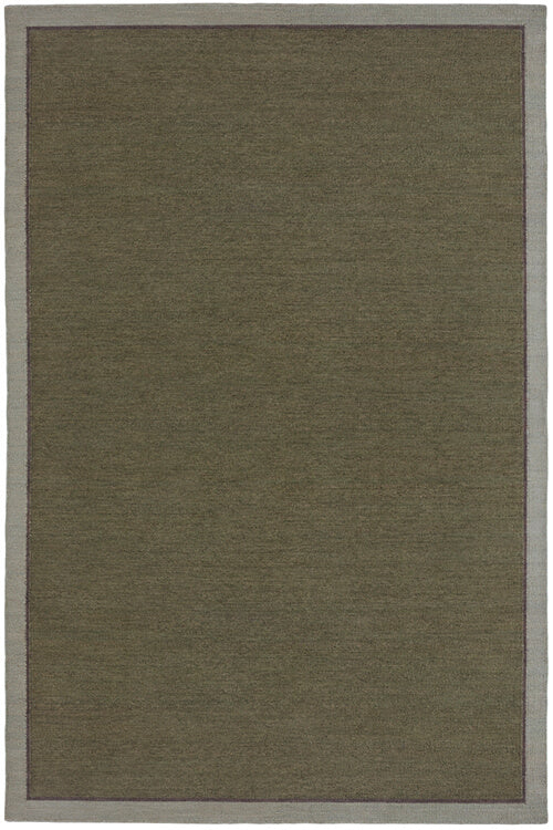 Flatweave rug in green with a brown and grey border.