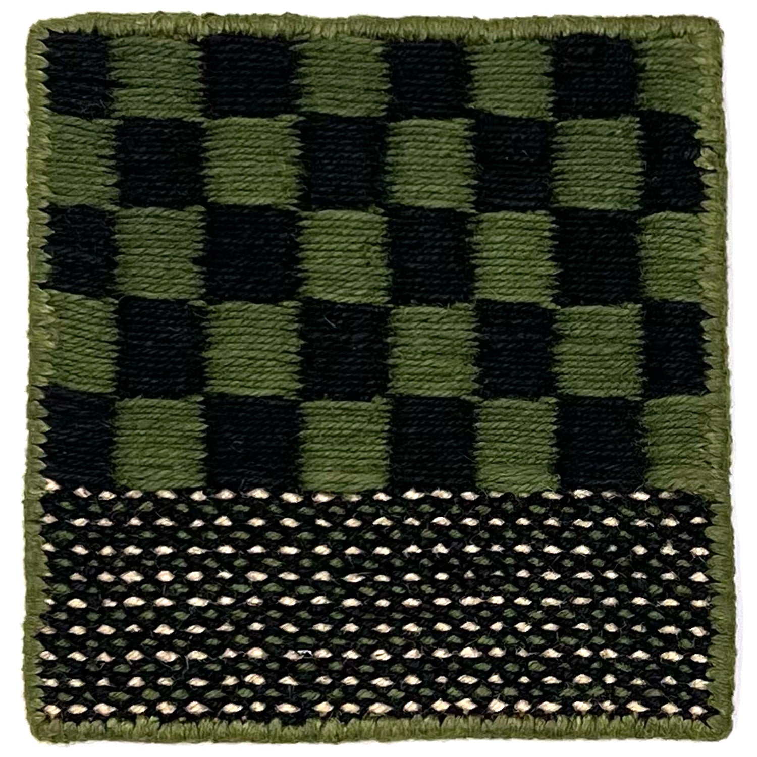 Flatweave rug sample in a green and black checkerboard with striped border.