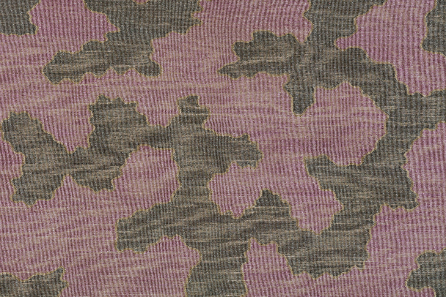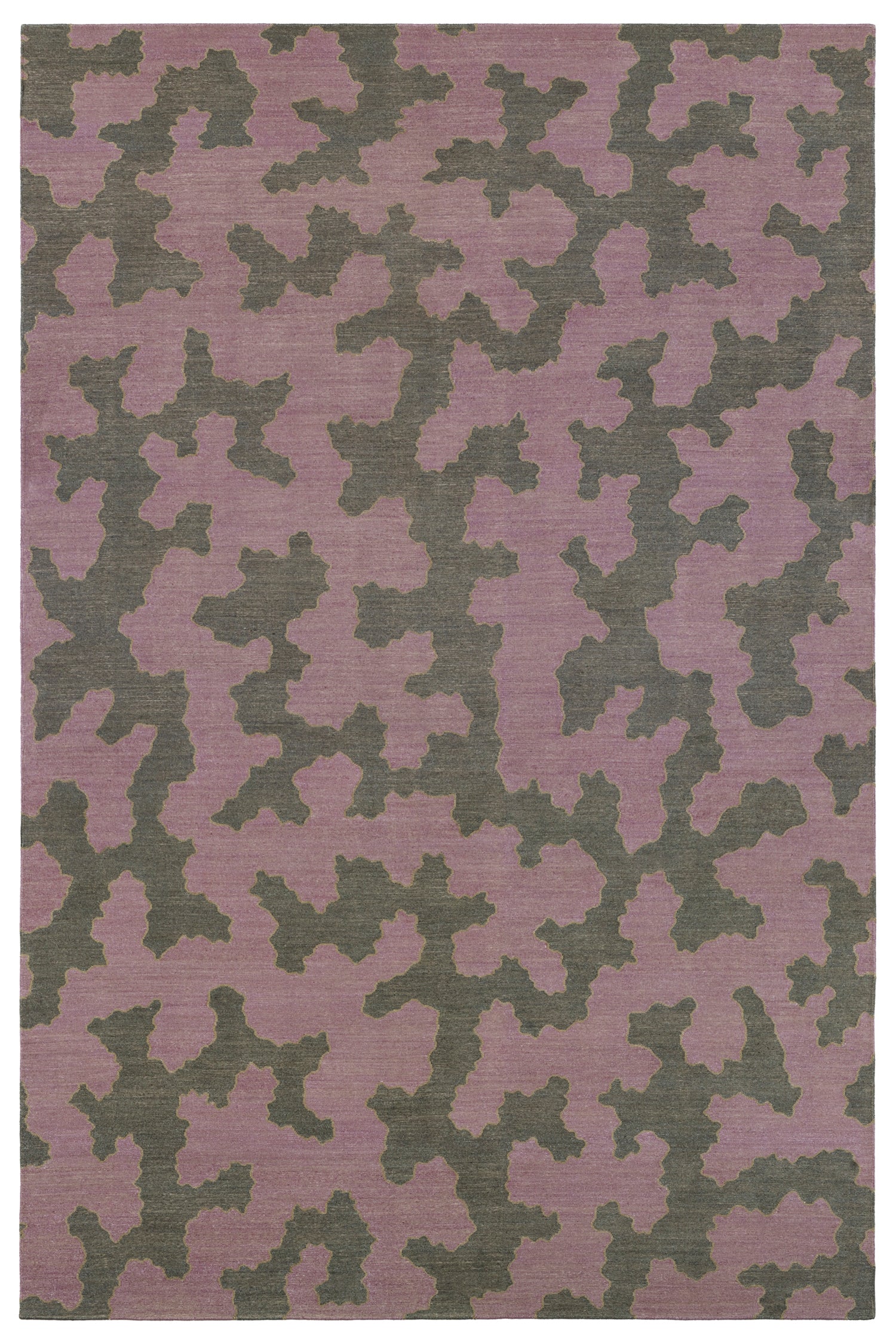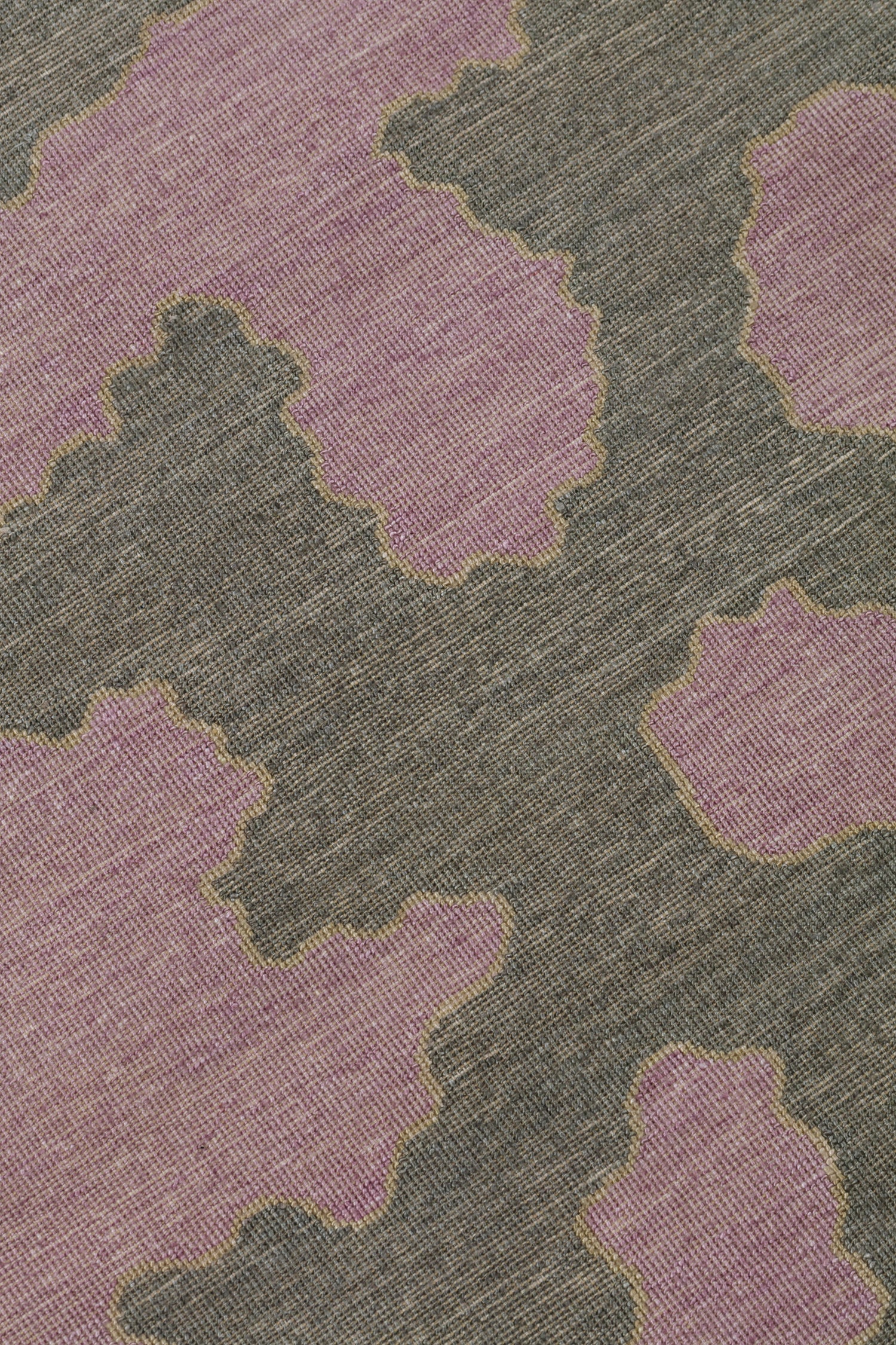 Detail of a handwoven rug in an abstract coral design grey and purple with a tan accent line.